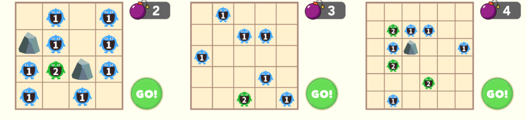 全部のモンスターに爆風が届くように、ボムを配置する問題です。全体を俯瞰して置く場所の候補を見極める平面認識力、試してうまくいかなければ除外して絞っていく試行錯誤の力が養われます。