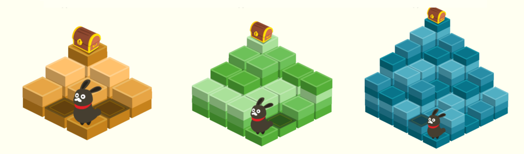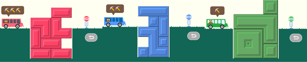 限られた手数でバスが通れるようにする問題です。「このブロックを壊すと、このブロックがここに落ちる」とイメージしながら試行錯誤を重ねることで、空間認識力が育まれます。