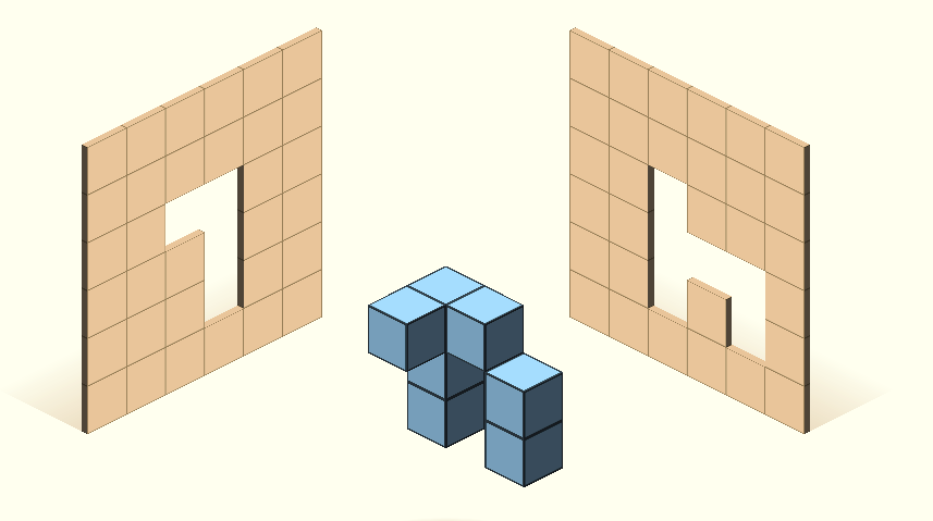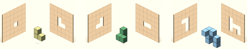 立体が左右どちらのパネルなら通過できるかを考える問題です。立体を別の方向から見るとどう見え方が変わるかを頭の中で正確にイメージすることで、空間認識力が培われます。