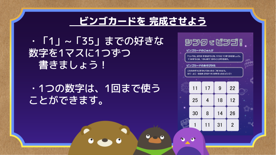 親子ミッションでは、自分で好きな数字を入れてビンゴカードを作ったあと、『シンクシンク』の問題がステージのスクリーンにランダムに出題されます。その問題の答えの数字がカードの中にあれば丸をつけていき、ビンゴが成立すればクリアとなります。