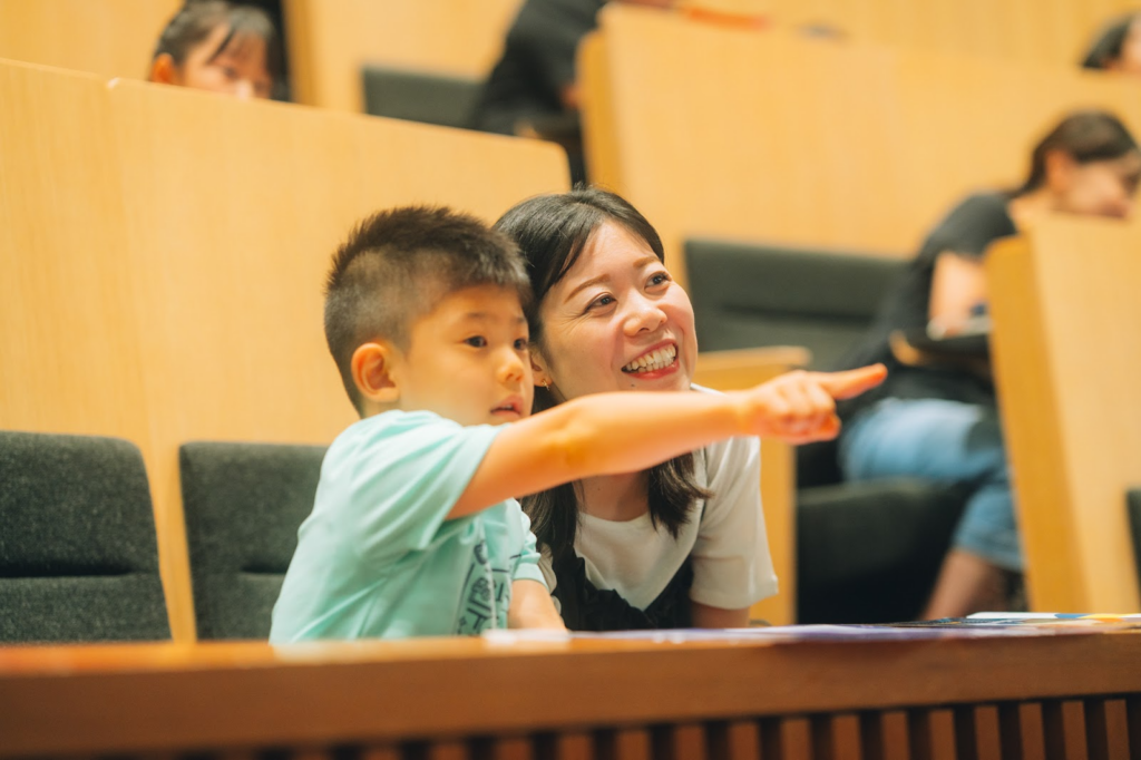 『シンクシンク』のスコアを競う大会ミッションの前に、まずはウォーミングアップとして、未来館ホールにて「親子ミッション」が開催されました。子どもたちはお揃いのTシャツを身につけ、それぞれのシンクシンクカップが始まりました。